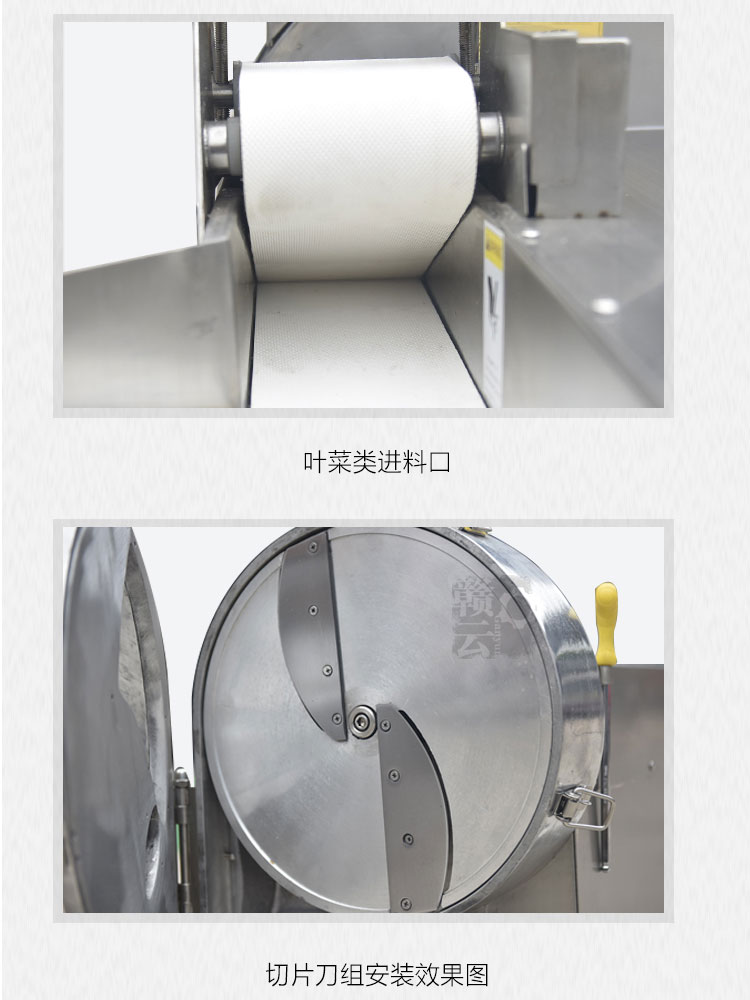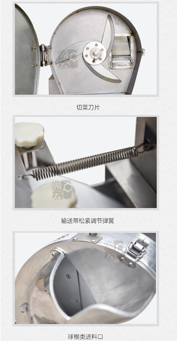 2.通過更換刀盤或雙調頻調節輸送帶與斬刀速度,可切出各種規格的片、絲、丁、條、粒。
