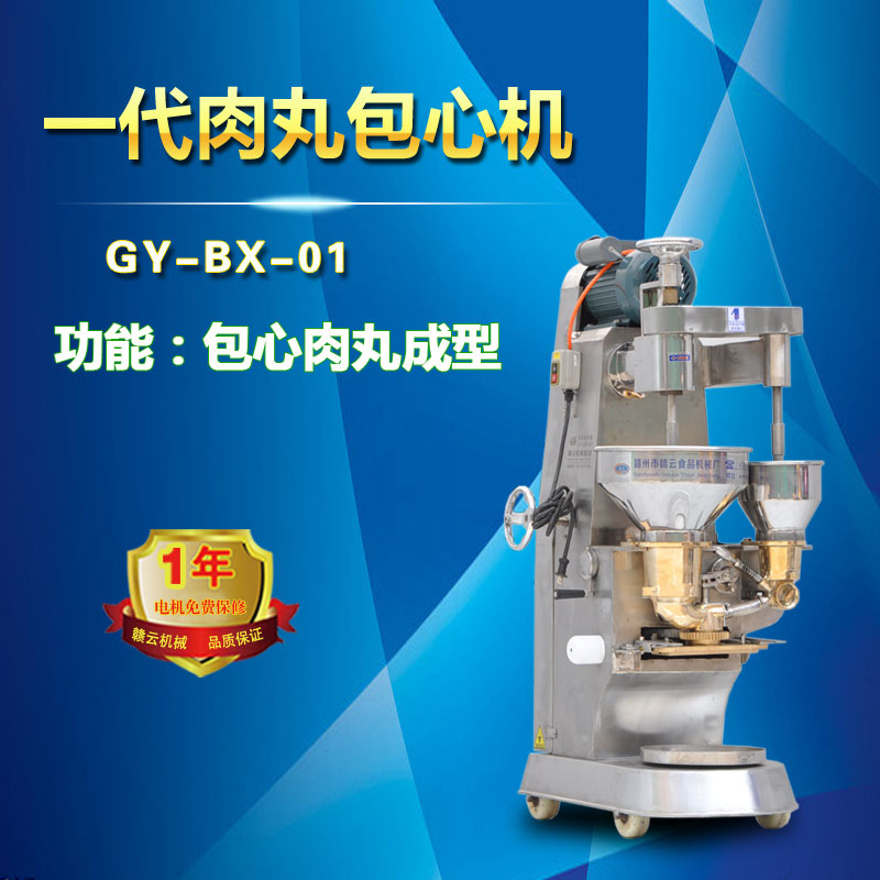 贛云牌新款第一代肉丸包芯機,包餡丸子成型機,外形更美觀,精致小巧,采用優質不銹鋼材質,部分接觸食品采用銅材料,符合食品衛生加工需求,能生產規格15mm-42mm之間實心丸子,生產28-42mm之間包餡丸子,成型規格統一,圓度好。