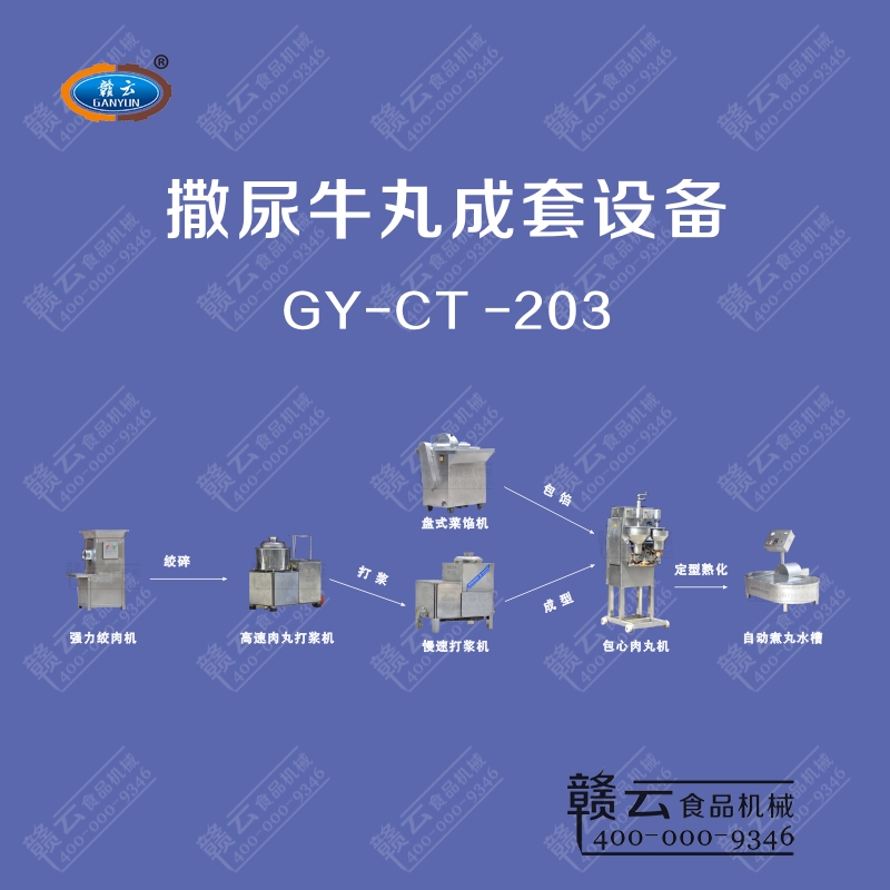 GY-CT-203系列撒尿牛丸成套設備由:32型強力絞肉機、28型全封閉式傳動高速肉丸打漿機、32型慢速肉丸打漿機、300型盤式菜餡機、第二代包心肉丸機和自動煮丸水槽六臺設備組合而成。