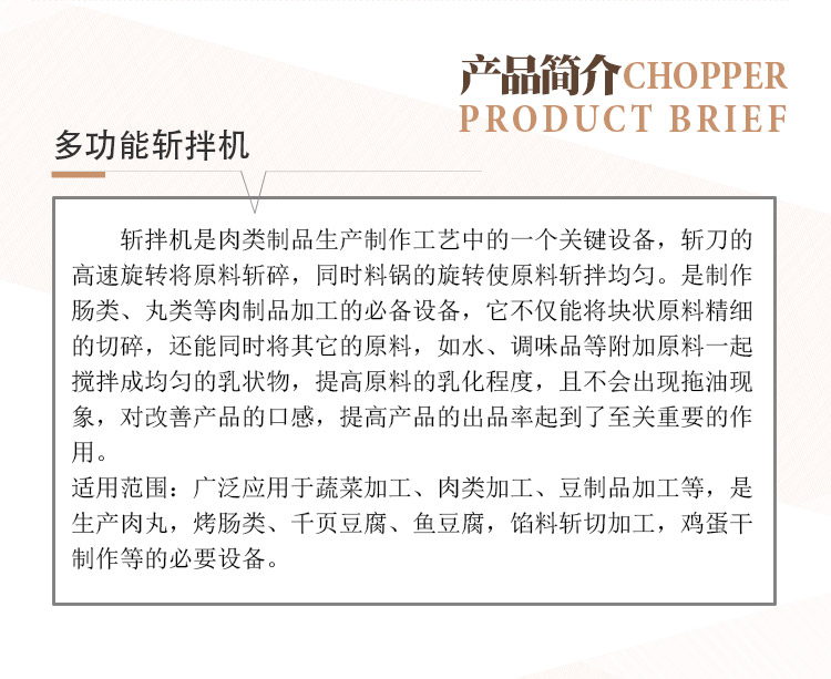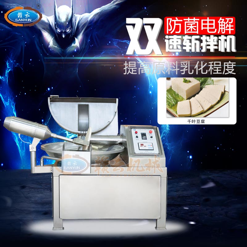 斬拌機是肉類制品生產制作工藝中的一個關鍵設備,斬刀的高速旋轉將原料斬碎,同時料鍋的旋轉使原料斬拌均勻。適用于制作腸類、丸類等肉制品加工設備,它不僅能將塊狀原料精細的切碎,還能同時將其它的原料,如水、調味品等附加原料一起攪拌成均勻的乳狀物,提高原料的乳化程度,且不會出現拖油現象,對改善產品的口感,提高產品的出品率起到了關鍵的作用。適用范圍:廣泛應用于蔬菜加工、肉類加工、豆制品加工等,是生產肉丸,烤腸類、千頁豆腐、魚豆腐,餡料斬切加工,雞蛋干制作等的推薦設備。