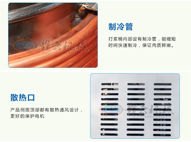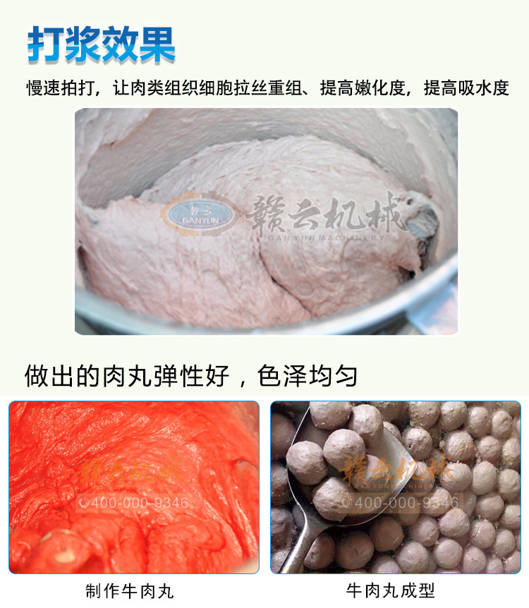 贛云牌36型壓縮機制冷式慢速肉丸打漿機,采用先進的壓縮制冷系統,對打漿外桶進行制冷,有效確保肉類制品在打漿過程肉類品質,防止升溫改變肉質,整機采用皮帶輪減速,通過慢速刀旋轉拍打肉粒魚糜等并調配成有一定粘稠度的漿狀物料,便于成型機成型,其拍打過程中能對肉類組織細胞拉絲重組,加大吸收水分,提高肉類的嫩化程度,打出來的漿類制成肉丸魚丸等,彈、脆、有嚼勁,產品一經推出,深受肉制品加工客戶青睞。