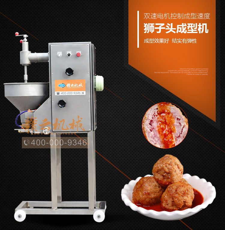 獅子頭機又名為大肉丸成型機,能做直徑45mm-65mm范圍的大肉丸,成型效果好,圓度好,表皮光滑,結實有彈性,是獅子頭成型上好設備。采用雙速電機分別控制成型速度,可調性靈活,操作簡單。