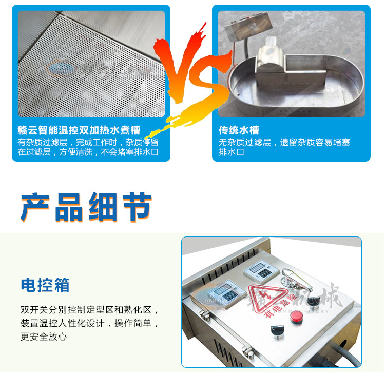 整機采用304不銹鋼板材設計,中間采用發泡劑,取保溫隔熱作用,雙槽加熱,獨立控制,定型熟化分別控制,加熱速度快,省電更省心。本產品量身設計可配套用于我廠生產的包心肉丸機、牛肉貢丸機、墨魚丸成型機、獅子頭成型機、雙調速肉丸機、火鍋丸子機組等多種肉丸成型設備使用。可加油,用于油炸丸子的定型熟化,可加水,用于各種肉丸的定型熟化,根據其加熱作用原理,也適用于其他肉制品的和非肉制品產品的熟化定型等用途。