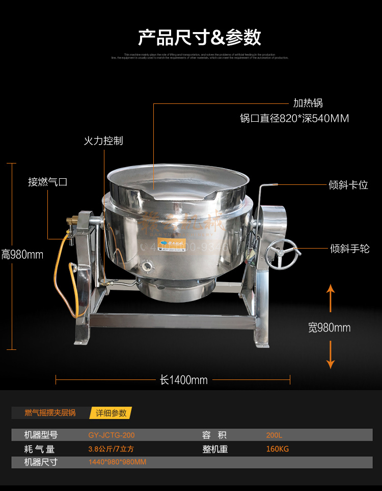 燃氣加熱湯鍋,熬湯鍋,不銹鋼200L大容量湯鍋適用于食堂餐飲連鎖企業,夾層鍋,每小時耗氣量約2.7kg, 天然氣耗氣量為6立方,搖擺式湯鍋