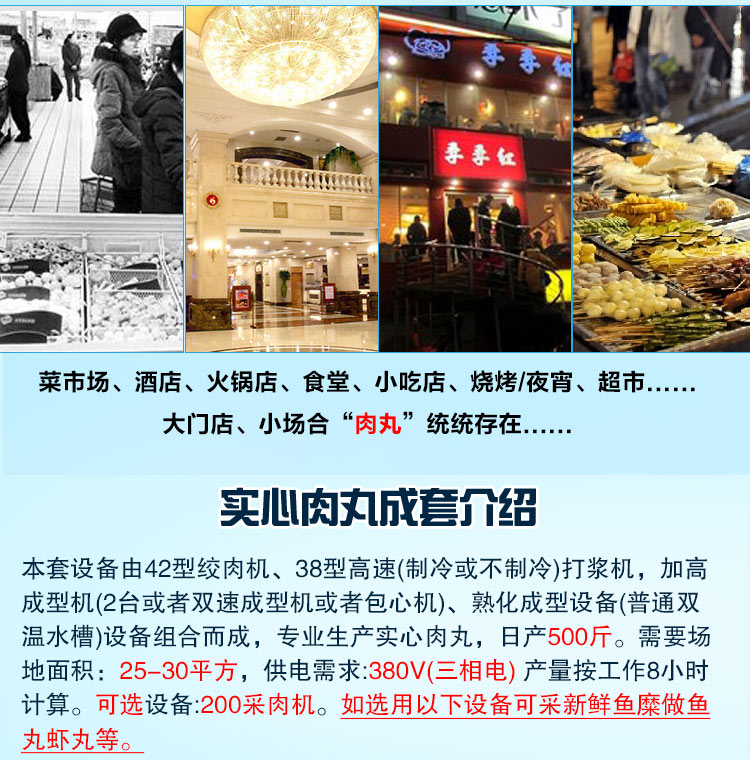 本套設備由42型絞肉機,38型高速(制冷或不制冷)打漿機,加高肉丸成型機(2臺或者雙速成型機或者包心肉丸機)、熟化成型設備(普通雙溫水槽)設備組合而成,專業生產實心肉丸,日產500斤。需要場地面積:25-30平方,供電需求:380V(三相電)產量按工作8小時計算。可選設備:200型采肉機。如選用一下設備可采新鮮魚糜做魚丸蝦丸等。