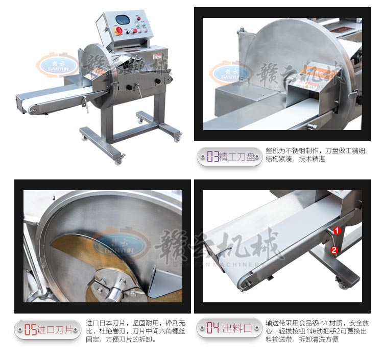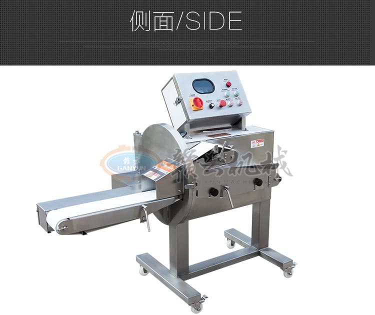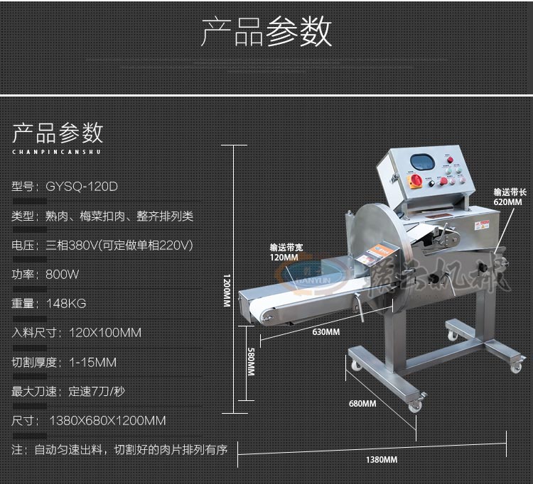 GYSQ-120D切熟肉機,專業切熟肉機可切扣肉、鹵豬耳朵、五花肉等,通過調整輸送帶的速度控制切割厚度,輸送帶越快厚度越厚,越慢越薄。適用于食堂、中央廚房、餐飲配送中心、肉聯廠、大型酒店等。變頻電控箱,通過調節輸送帶速度控制切割厚度,按鍵防水設計,可拆卸輸送帶。優質刀片,杜絕卷刃。