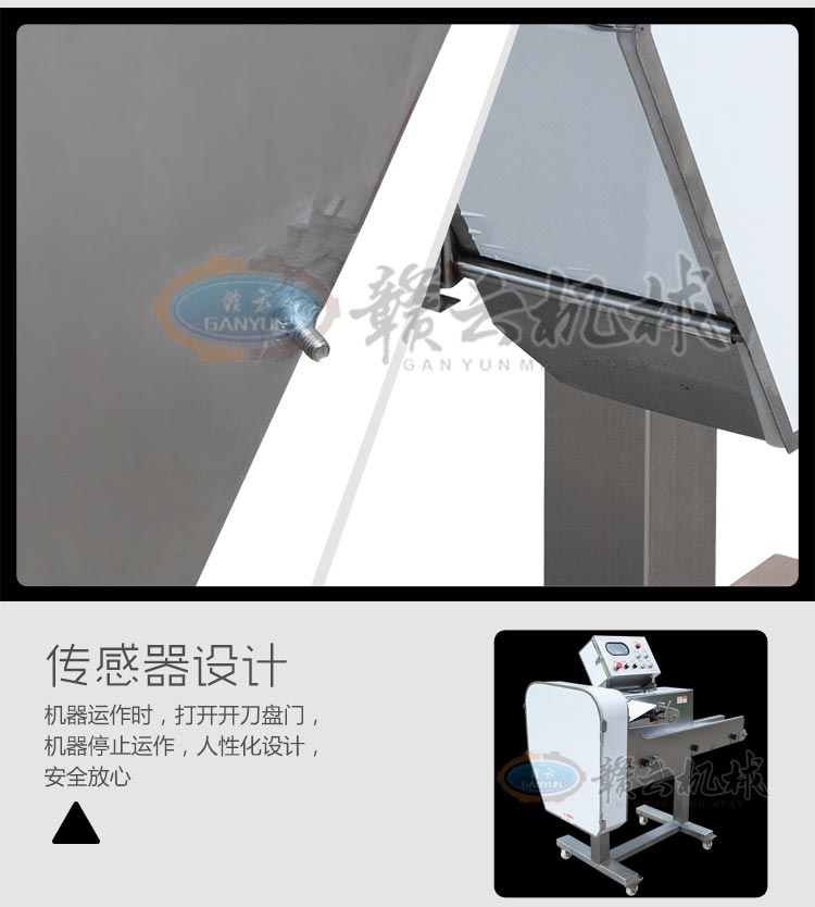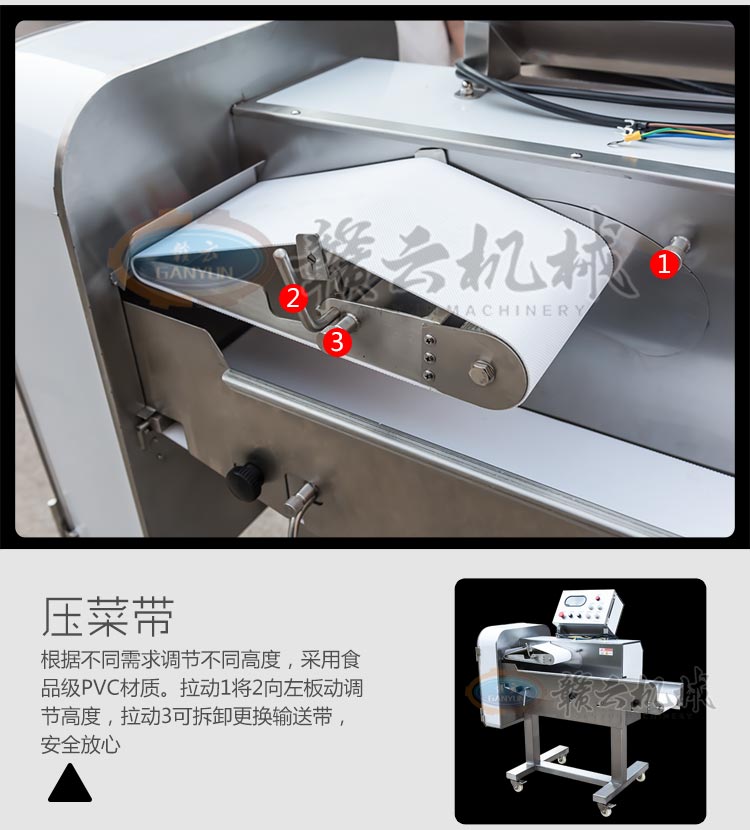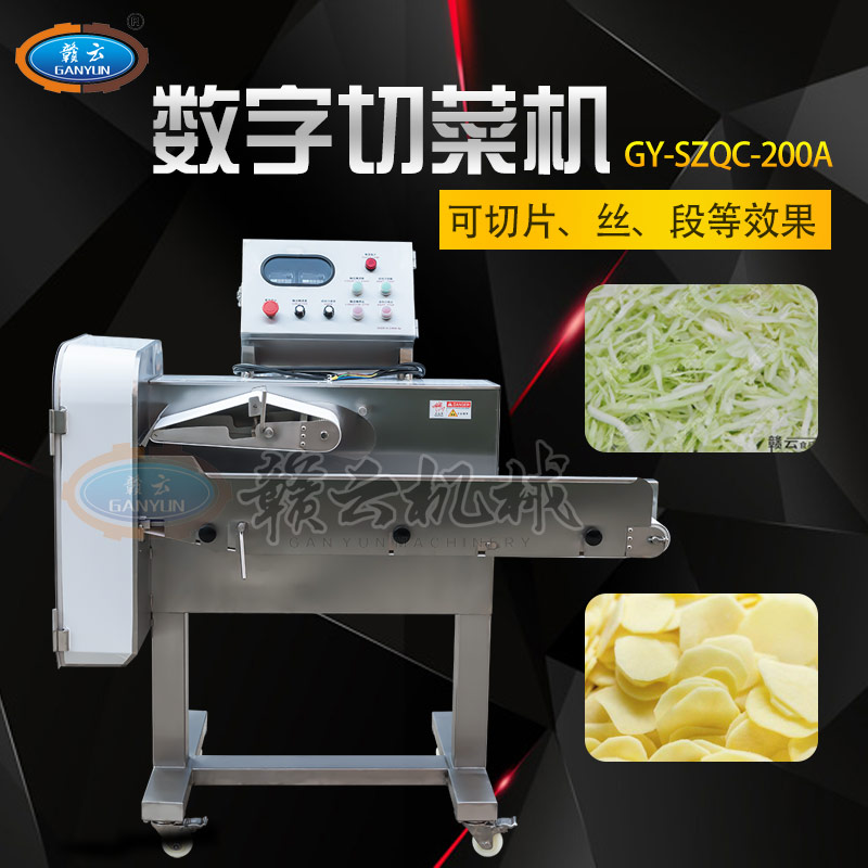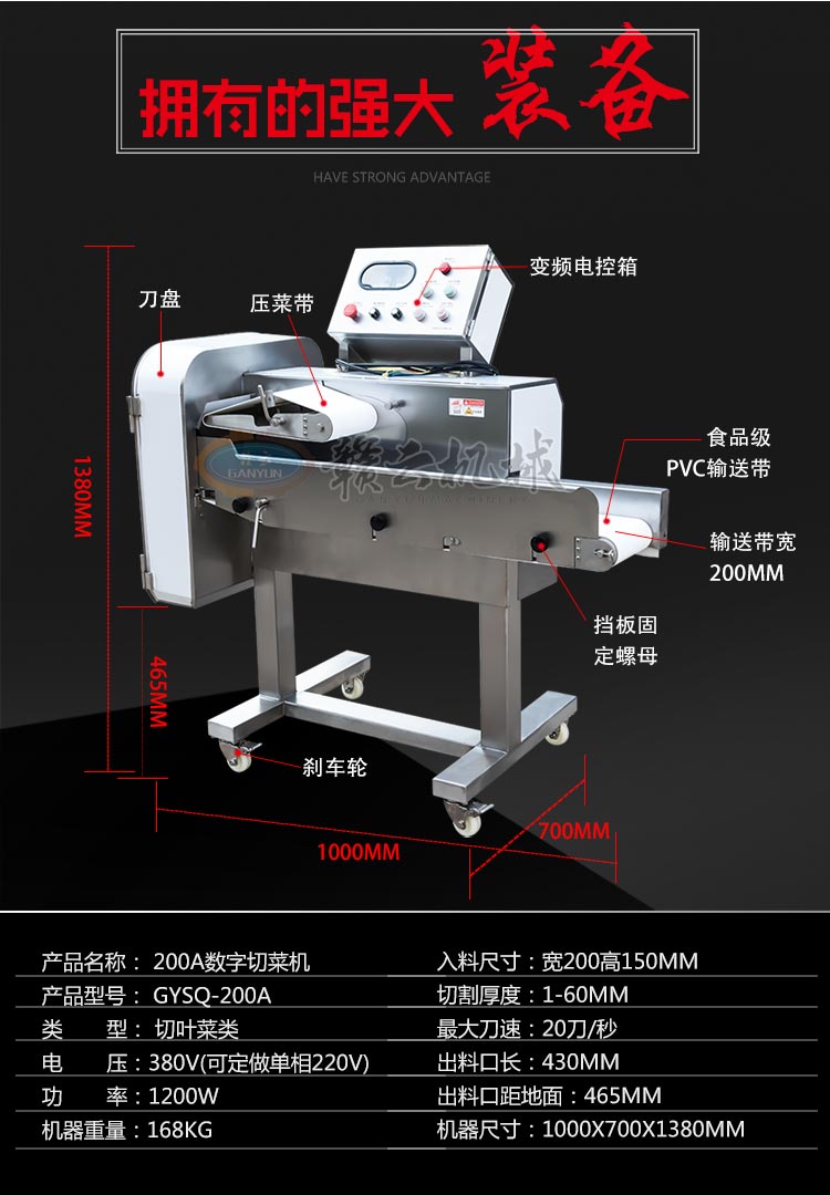 GYSQ-200A數字切菜機多功能數字切菜機,一機多用,多樣化切菜,優質刀片,經久耐用,杜絕卷刃。輸送帶松緊微調裝置,壓菜帶采用食品級PVC材質,可拆卸更換輸送帶,安全放心。機器傳感器設計,機器運作時,打開刀盤門,機器停止運作。