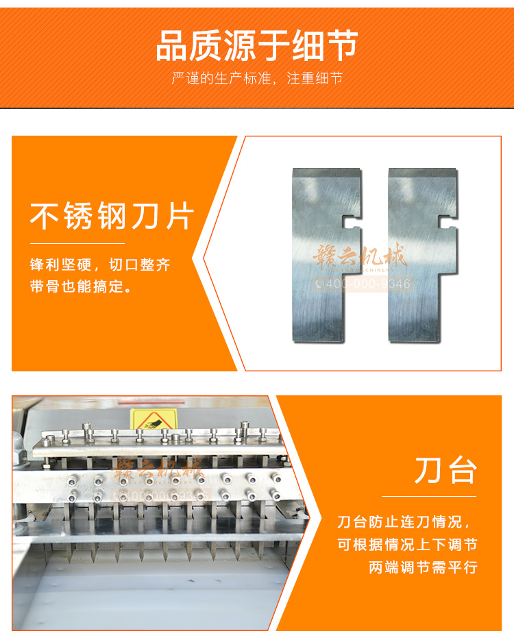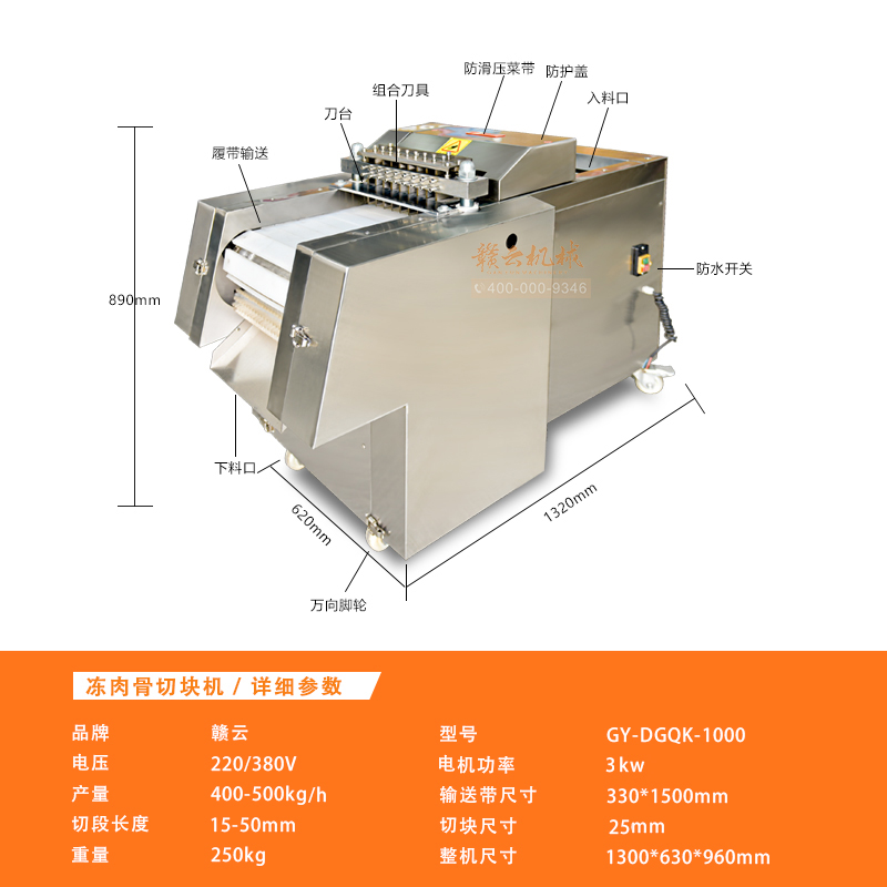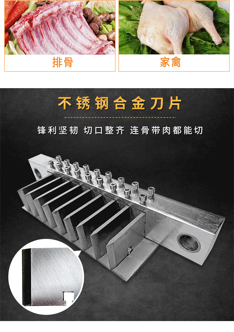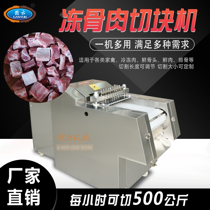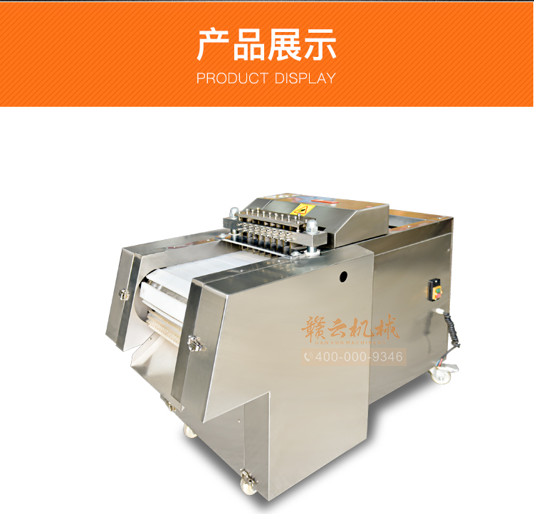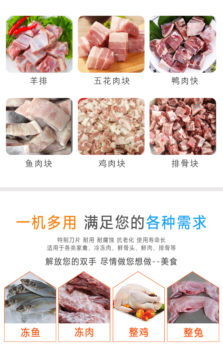 適用于雞、鴨肉、中小型動物骨頭、排骨、冷凍肉、鮮肉、凍雞、雞腿等加工設備,可根據需要剁塊、段、條等形狀大小可調。本機性價比高,節省人工,一機可抵多個人工作,每小時可剁切1000公斤,大大提高生產效率。廣泛用于大中小型食品加工廠、集體食堂、屠宰場、肉聯加工廠、超市、飯店等地使用。