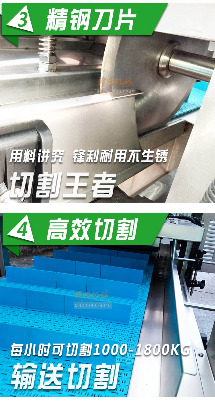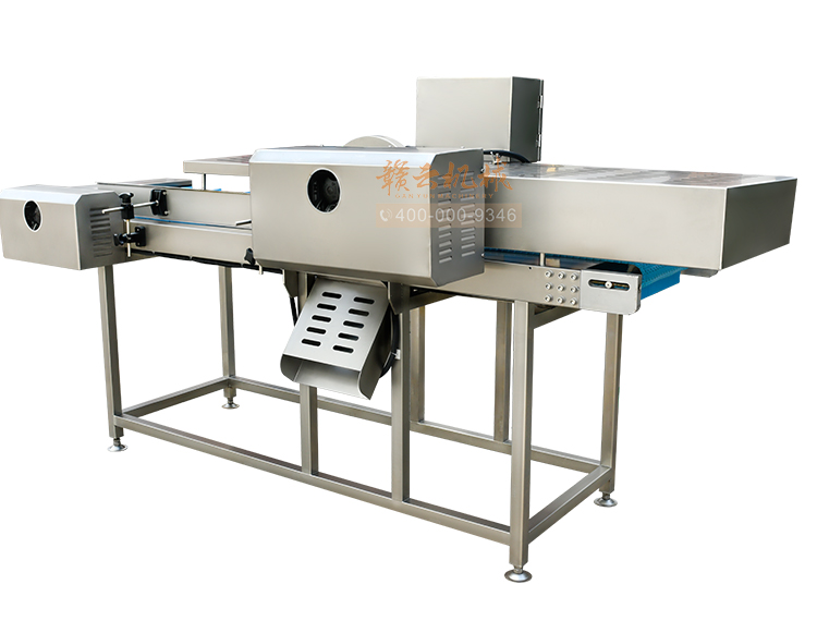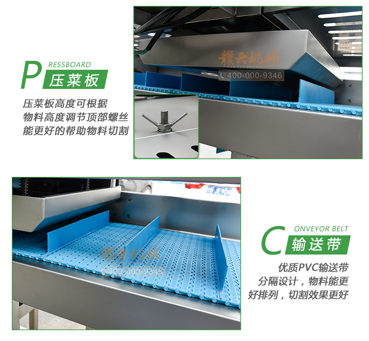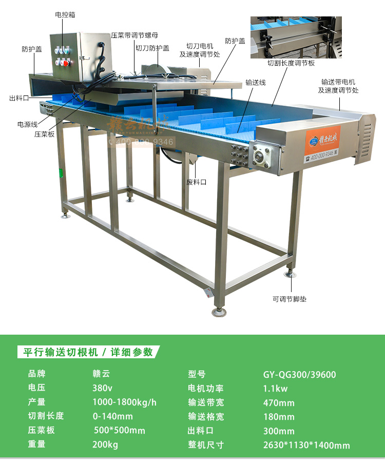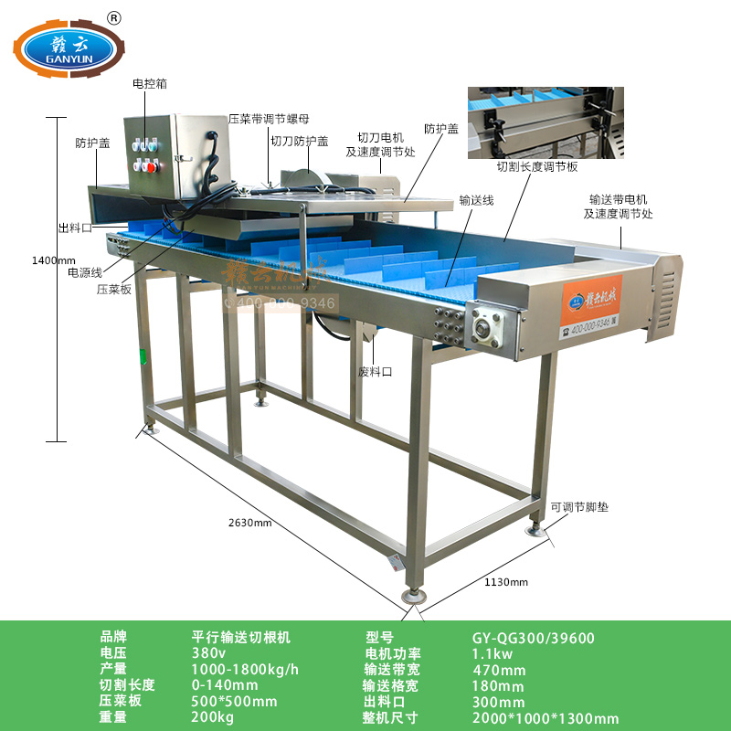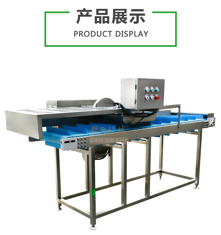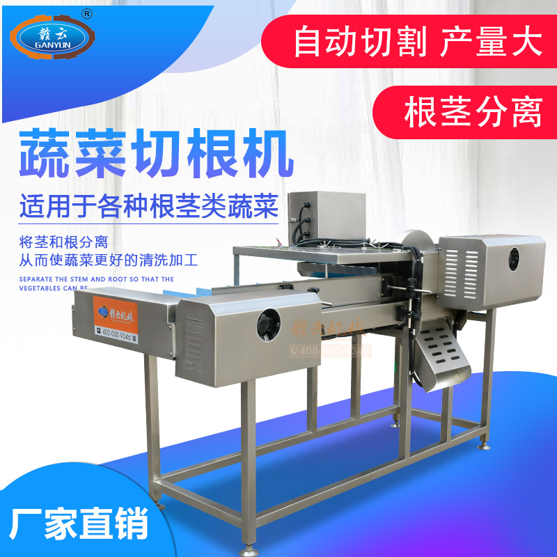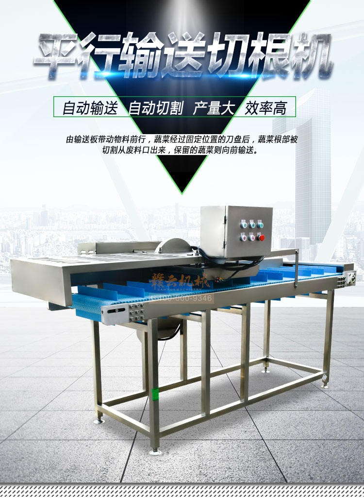 平行輸送去根機由輸送板帶動物料前行,蔬菜經過固定位置的刀盤后,蔬菜根部被切割從廢料口出來,保留的蔬菜則向前輸送。切割的長度可以調節,每顆蔬菜所切割出來的廢料都相等。去根機適合大型食品加工廠、凈菜生產線等。