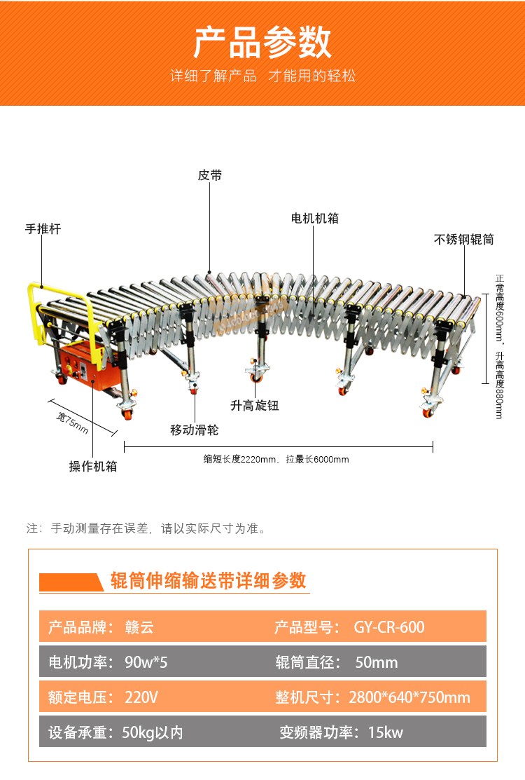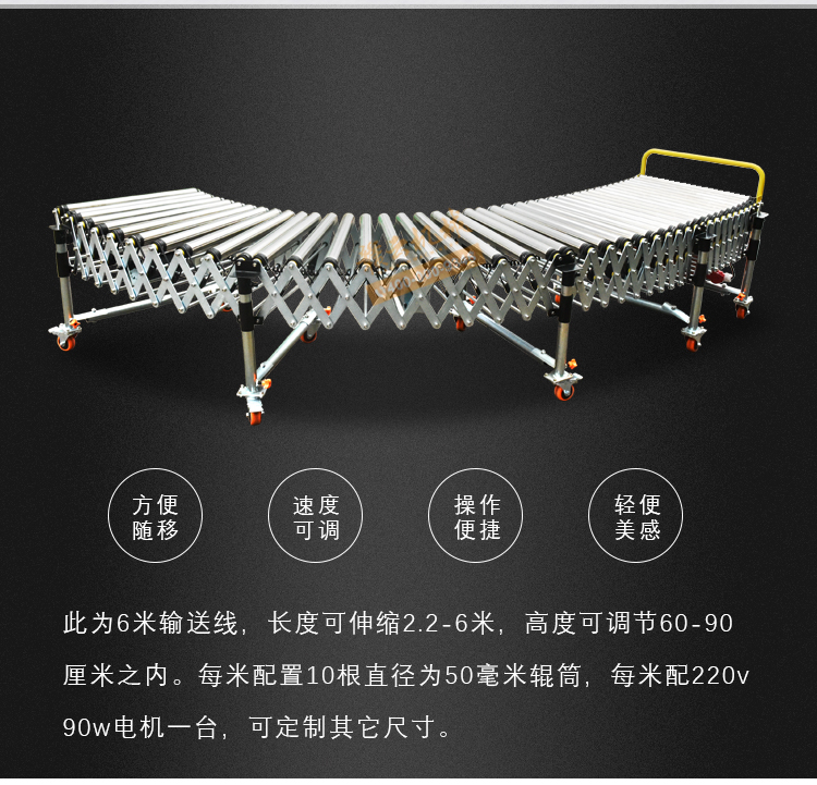 此為6米輸送線,長度可伸縮2.2-6米,高度可調節60-90 厘米之內。每米配置10根直徑為50毫米輥筒,每米配220v 90w電機一臺,可定制其它尺寸。