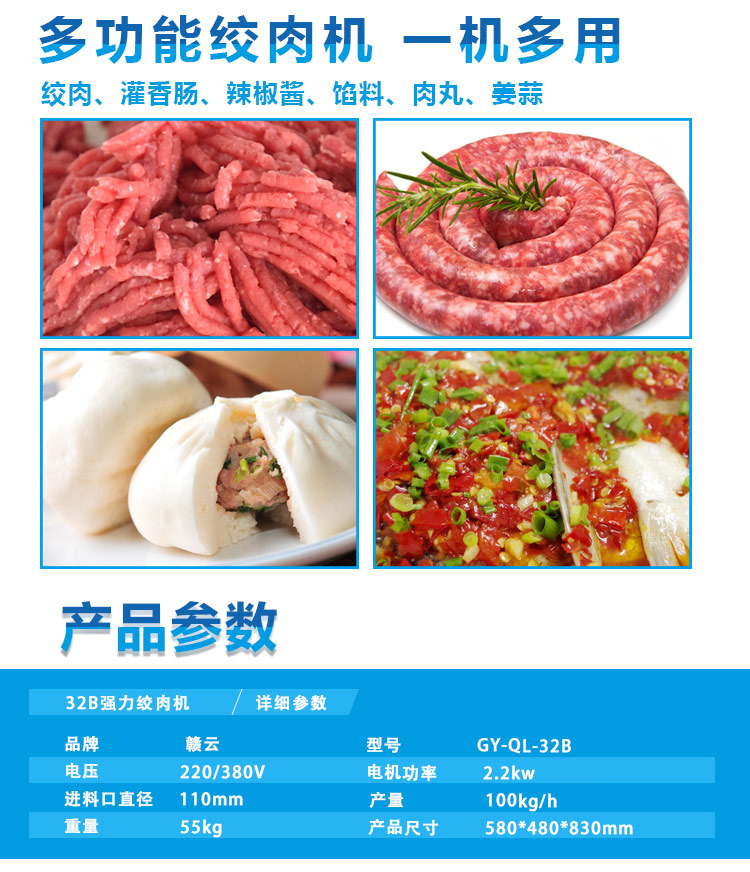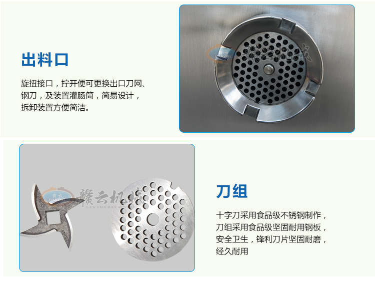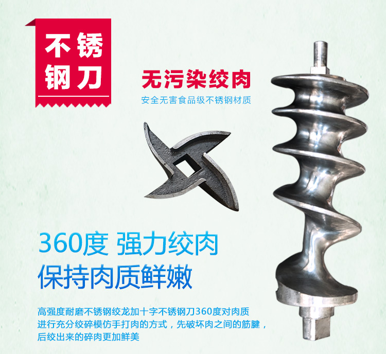 這款32B型強力絞肉機采用不銹鋼材質加工精致而成,改傳統的鑄鐵絞肉機頭為不銹鋼絞肉機頭,使之接觸食品部位均為不銹鋼材質,不生銹,達到食品安全衛生要求。