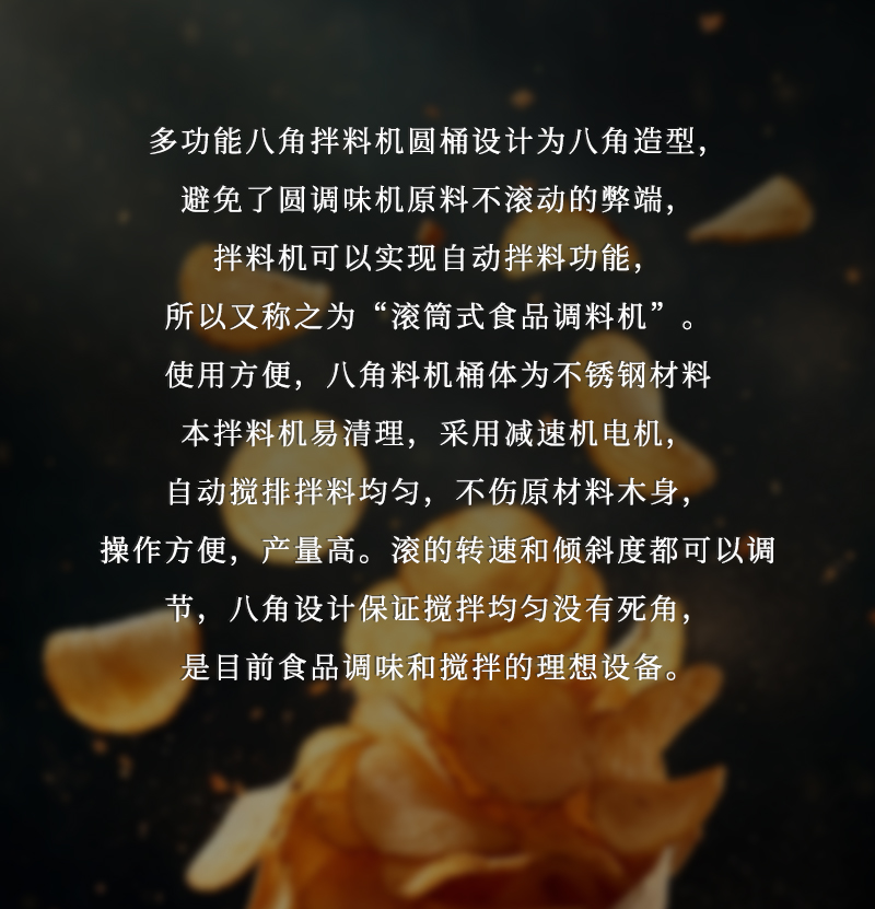 適用于堅果、蠶豆、牛肉干、薯片、花生、月亮巴、鍋巴等食品的快速均勻上料調味。