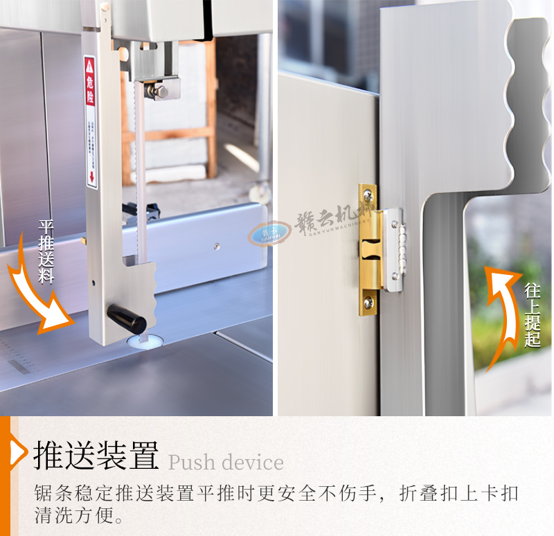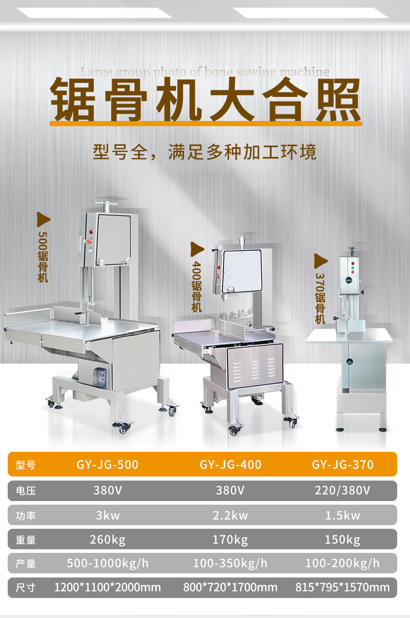贛云機械旗下全自動大型商用鋸骨機設備,采用304不銹鋼材質,具備大容量工作臺、操作簡便、高效率的切割、采用可滑動的臺面助推和其它多種推料設計,讓機器更安全。鋸骨機適用于大型食品廠、水產加工企業、肉類加工企業、大型屠宰廠、中央廚房等場所。能對凍肉、硬骨頭、冷凍魚、豬腳、排骨、羊蝎子、豬頭、牛頭等快速精準切割。我廠的鋸骨機設計人性化,以安全、衛生、易于清潔和保養等優勢受到客戶的信賴。