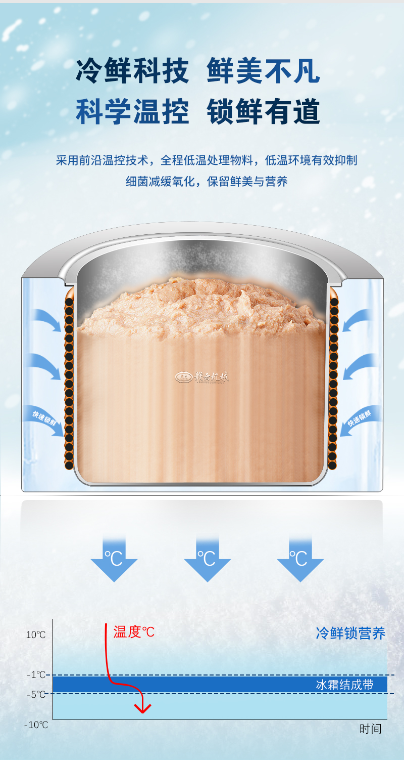 冷鮮科技、鎖鮮有道,通過低溫制漿技術,改善肉質脂肪纖維讓食品更細膩、口感爽脆、彈性好。