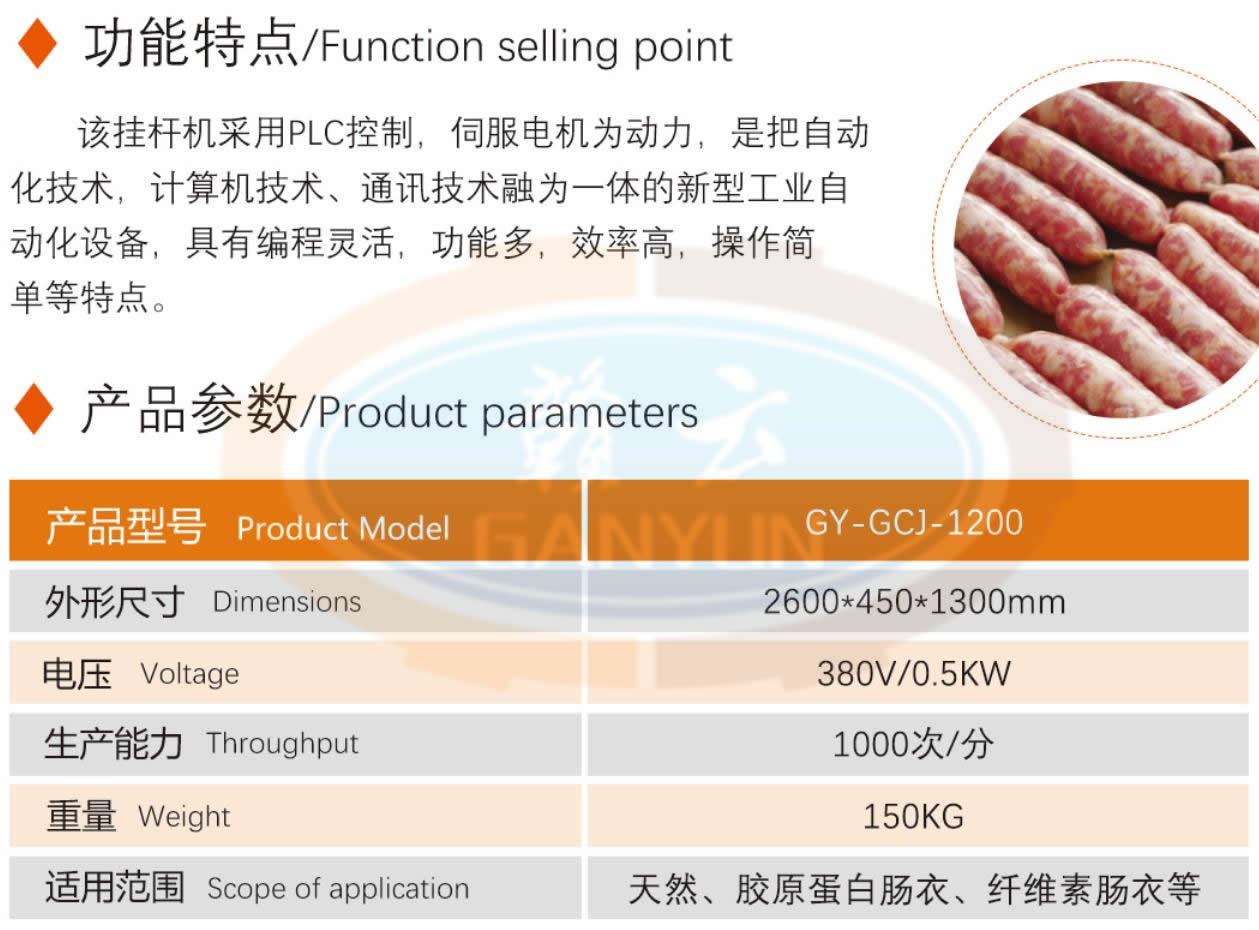 主頁-> 肉制品前處理->專用灌腸設備->1200自動香腸掛桿機