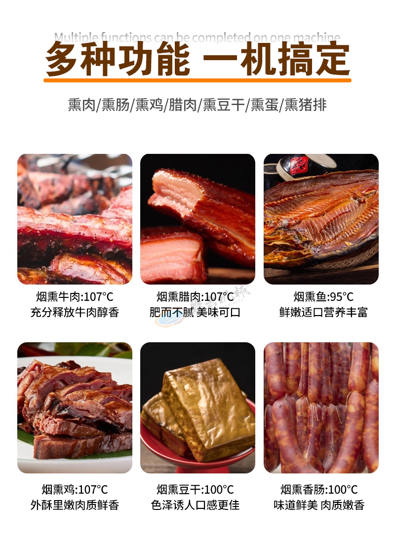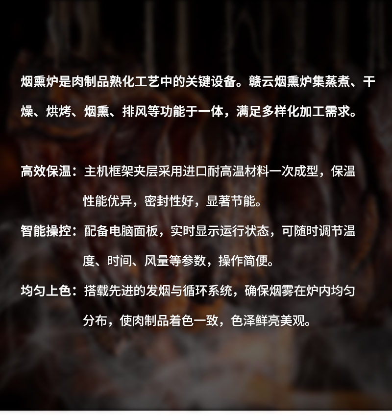 煙熏爐集蒸煮、烘干、煙熏等功能于一體,適配熏肉、熏腸、豆干等多品類加工,高效智能,助力肉制品均勻上色、提升賣相。