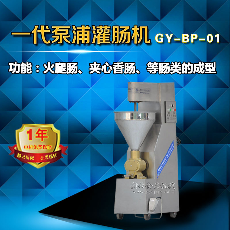 泵浦式灌腸機:可自動灌制各種香腸。火腿腸及臺式熱狗腸等等,產量能達到300kg/小時,操作方便。配有大、中、小管模可調換。設備配置電動、連動及腳踏控制系統,配套電機可調速生產。