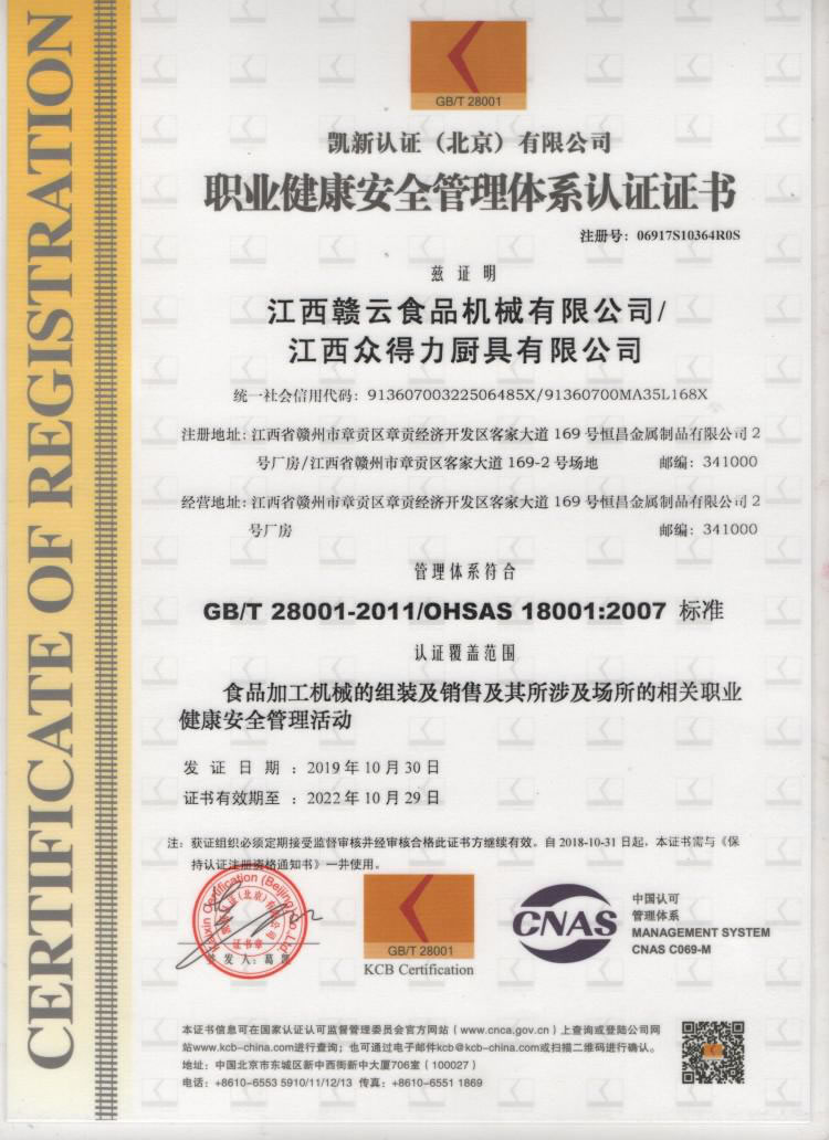 職業(yè)健康安全管理體系認證證書