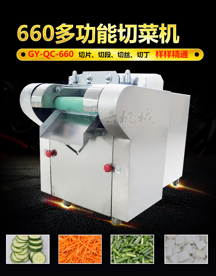 一機多用,擁用切菜機、切丁機、切絲機、切片機的功能,集多功能于一身。可將根莖類切成厚、薄片、絲條、丁等外形。葉菜類之輸送帶轉刀速度采用變頻器控制,獨立控制。成品形狀: 片、四角絲條、丁。