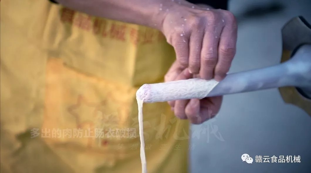 ③當出現腸衣破損時,要將其從破損處切掉扎口,將溢出的肉放入機器重新灌制;